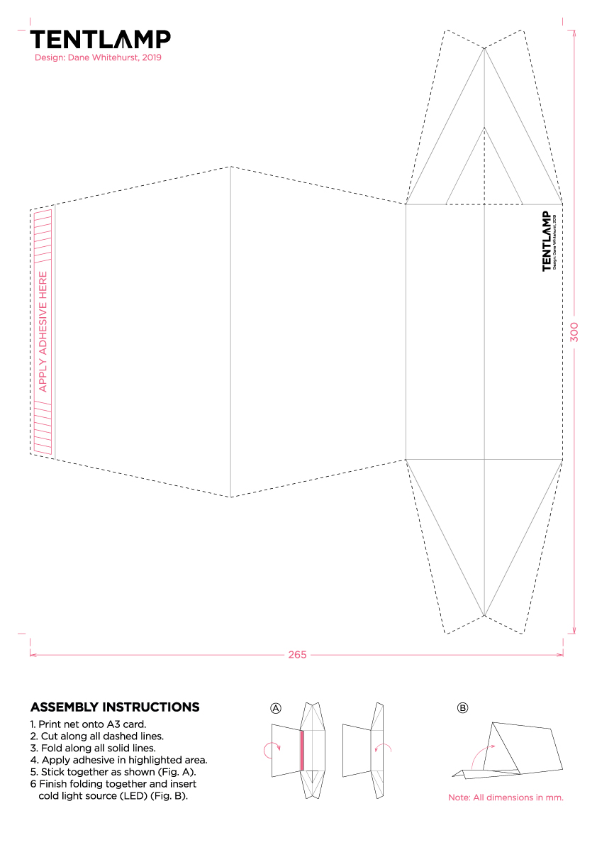 Tentlamp was designed to celebrate our family's first camping adventure. It lives in my daughter's room and reminds us of warm summer days, toasted marshmallows and playing guitar around the campfire with friends. It is made entirely from cardboard and you can make one yourself by printing out the net at the bottom of the page onto your favourite coloured card.